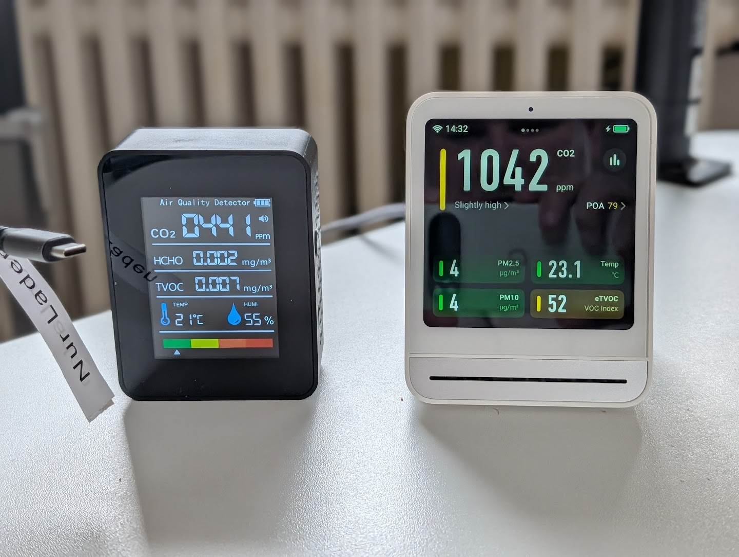 Rechts der Quingping mit den korrekten Werten. Links das Ding, was keine Probleme erkennen will, obwohl die Luft im Raum mal dringend ausgetauscht werden müsste.